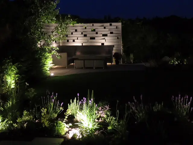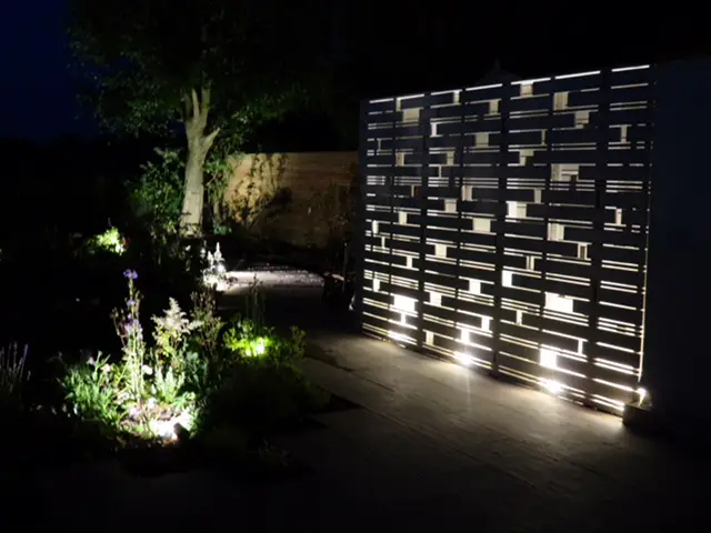 A combination of porcelain paving, timber-effect cladding and a sleek contemporary fence gives the garden a refined, cohesive feel. Integrated lighting enhances the structure and atmosphere, transforming the space into a calming environment both day and night.